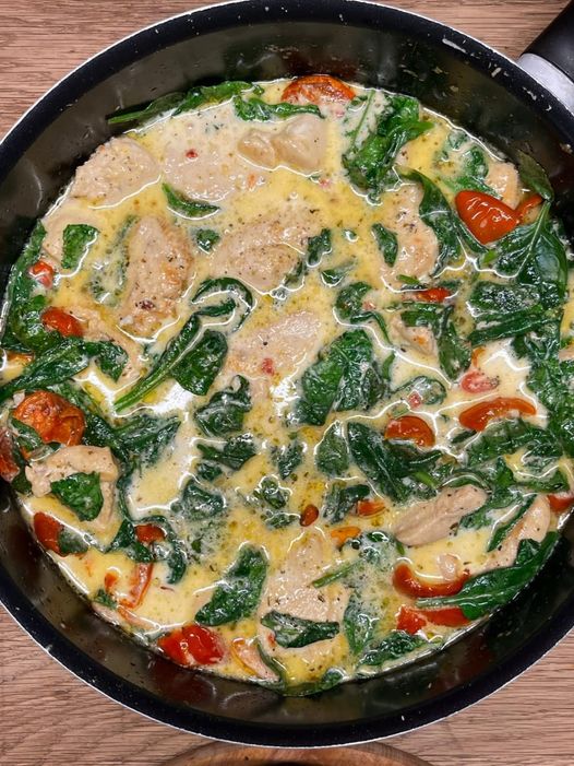 Ingrédients 4 filets de poulet 2 c à s d'huile d'olive 250 ml de crème min 35% 125 ml d'eau 1/2 cube de volaille 2 gousses d'ail 140 gr de parmesan râpé 3 bonnes poignées d'épinard frais 175 gr de tomates semi-séchées/ confites Couper les filets de poulet en morceaux et les faire revenir dans l'huile d'olive Réserver les morceaux de poulet dorés Dans la même sauteuse, faire revenir l'ail pressé, ajouter l'eau, le cube, la crème, le parmesan Fouettez à feu moyen jusqu'à ce que ça commence à épaissir Ajouter les morceaux de poulet Et puis les morceaux de tomates confites et les épinards. Servir avec des tagliatelles Bonne dégustation !